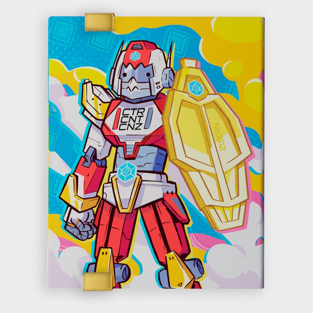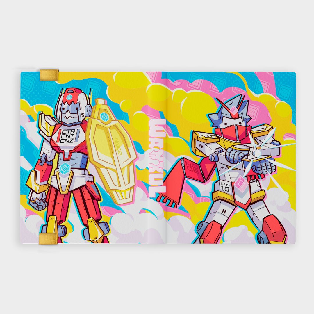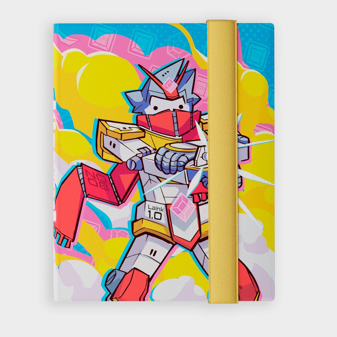 Un Mécha-Laink/Terracid en ultra-pose badass, sur fond de couleurs explosives façon “on sait pas ce qu’il s’est passé mais c’était fun”. Bref : tu le sors → tu flex.