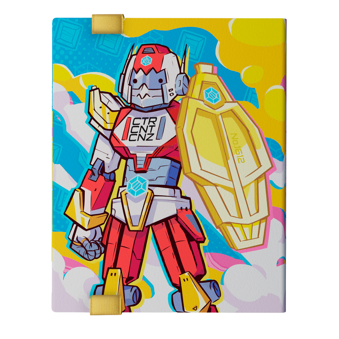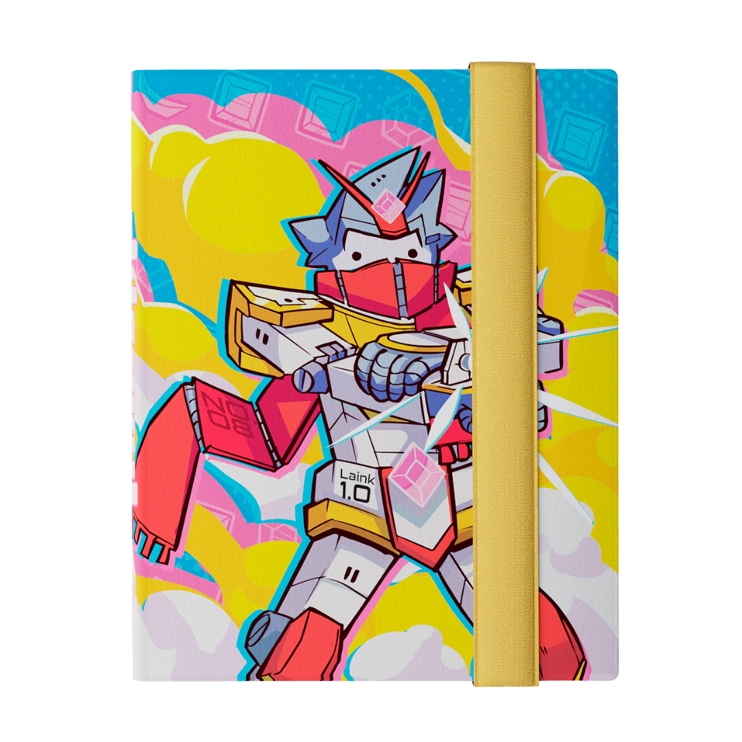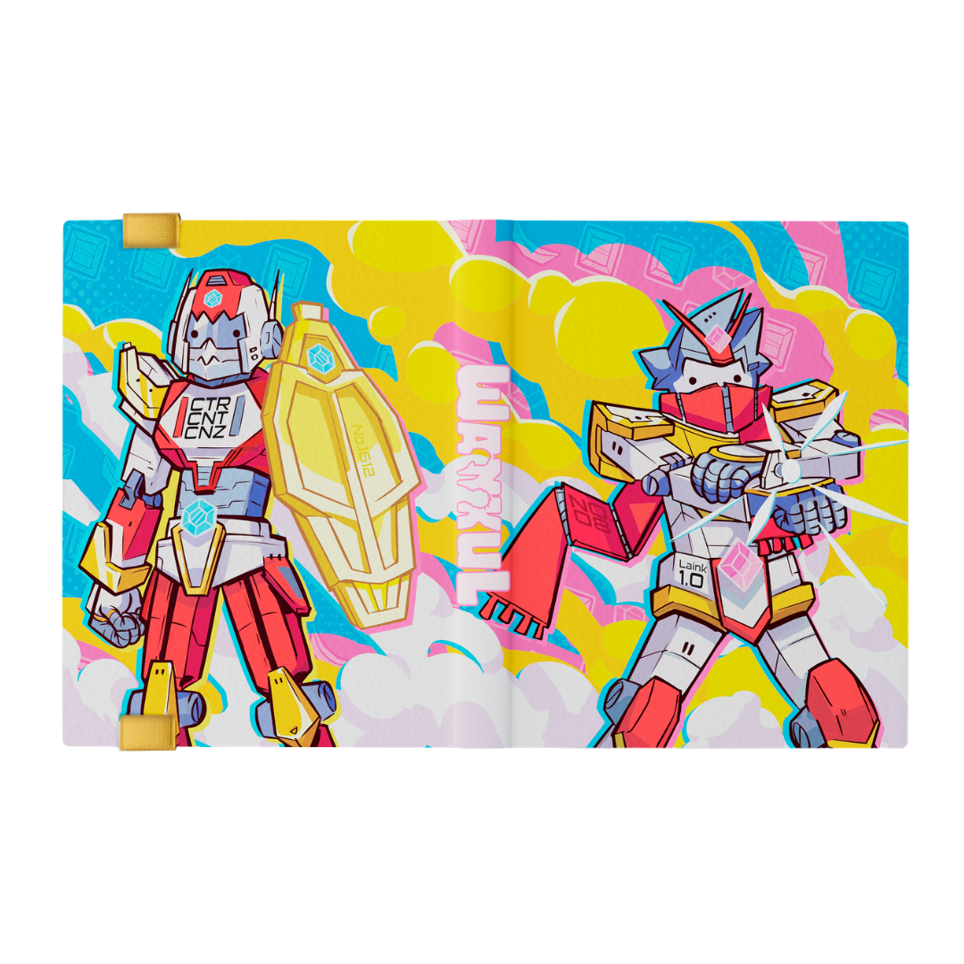 Un Mécha-Laink/Terracid en ultra-pose badass, sur fond de couleurs explosives façon “on sait pas ce qu’il s’est passé mais c’était fun”. Bref : tu le sors → tu flex.